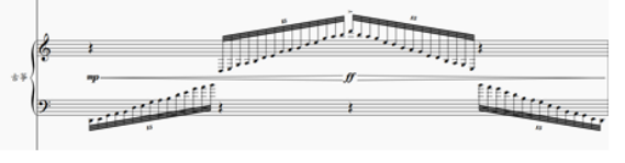 《黄金水道》中首次出现的水主题具有奠基意义,它以D-E-G-A-B五声音阶为骨架,通过筝与竖琴连续的十五连音上下密集刮奏,在“梭形”力度(mp-ff-mp)变化中形成涟漪般层层推进的流动轮廓(见谱例1)。在随后的乐章中,水主题根据不同文化内容的需要发生形态、风格变化。《漕运沧桑》中,水主题被压缩为短促而强势(fff)的刮奏音型,以表现运河的沧桑与厚重(见谱例2);《江河万古流》中,笙独奏主题延续水主题上下波动、长线条展开的旋律特征,通过音高的渐次出现弱化事件指向,将水流转化为跨越时间的精神象征(见谱例3)。在《运河明珠》中,阮独奏的漫游主题依然保留了水主题的基本形态,并通过分解和弦、滑音与震音的运用强化水波荡漾的听觉联想。水主题核心形态在不同语境中的保留,使各乐章主题虽在内容与风格上各有侧重,却在听觉上始终指向水这一意象,维系了作品整体的内在统一。水主题的变化发展生动诠释了“水无形而有万形”的文化意蕴。
