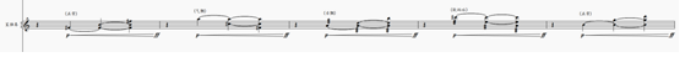 除水主题之外,其他主题的设计同样服务于运河多元文化侧面的建构。《舟楫通南北》通过两个风格迥异主题的并置与融合,呈现运河作为世界文化交流通道的功能。梆笛、曲笛及小堂鼓、小锣奏出A羽六声调式(A-B-C-D-E-G)构成的民间音乐主题,营造鲜明的江南市井气息,随后邦戈鼓、康佳鼓引出基于双增二度音阶(E-F-#G-A-B-C-#D)(谱例4)的异域风格主题,其不对称音程结构与紧张的音响色彩,在音高层面形成与传统五声体系的对位关系。随后,两个主题通过音区交错、配器扩展与材料重组,完成主题的对峙、交替与融合,使东西方文明交流的过程在音乐中清晰呈现。