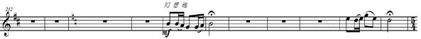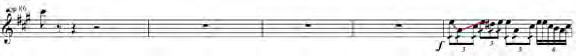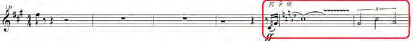 第二乐章《血洒孟良》的尾声为211~227小节。在尾声中,于216、221小节处零星出现了第二乐段中“节奏动机”的变形再现(谱例15),全曲经过一个13连音的密集时值的上行级进进行之后,全曲结束在E角音上。