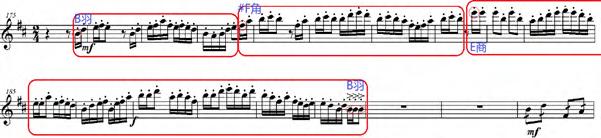 第三段第二部分为126~139小节,起始于E徵到A宫的跳进,还有变徵音♯D的出现,所以调性很明确,为A宫系统雅乐。该部分主要由旋律动机的连续模进构成,此处动机为“折线动机”的变形。
