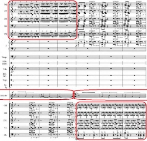 协奏部除了可以与主奏部配合,共同演奏旋律来达成特定音响效果之外,协奏部也可以直接演奏旋律,利用不同乐器组音色的变换,与主奏部单一音色产生对比,如第二乐段第二部分。这部分尽管协奏部演奏的与前面主奏部所陈述的旋律完全一致,但各乐器组分别演奏,犹如调色板一般,给同一段旋律赋予了多样的色彩,在音色上与之前主奏部所奏旋律产生对比,旋律重复但音响不显单调。
