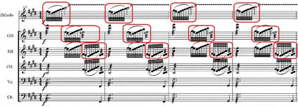 总得来看第三乐段,该乐段由两种动机分别发展为两部分,构成对比性的二部结构。该乐段音符密集,速度较快,采用模进的发展手法,表达出了紧张迫切的音乐情绪。第三乐段音乐的核心仍旧是主奏部,协奏部乐队还是根据主奏部的节奏配以和声。