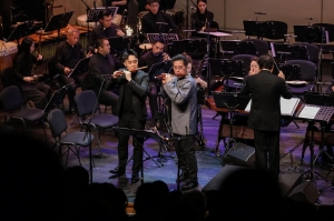 本场敲击乐声部的演绎呈现专业功底,演奏家们精到把控鼓、镲、锣等乐器的音色层次:轻敲清脆如珠落玉盘,重奏雄浑如雷霆万钧,轮奏、滚奏技法运用自如。 既为吹管旋律搭建起节奏骨架,又以独有的音色质感形成独立的音乐表达,在全新编排下,《闹花灯》《欢送》留住了原生的乡土情韵与民间意趣,又被赋予更鲜活的现代律动与结构美感,老曲新声、气象焕然; 终曲《祝贺》由张维良与钱青共同演奏,敲击和吹管两大声部交织推进,构成一场酣畅的“并进式对话”,将整场音乐会的情绪推向高潮,兼具民间吹打乐的热烈质朴与现代舞台的艺术质感。