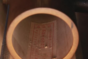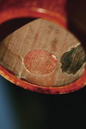 特别值得关注的是李磊石藏琴。李磊石是20世纪中叶上海显赫一时的乐器收藏家。北京的马良正、史善鹏、洪广源等都曾为他修缮和推荐老琴,赵济羹、杨宝忠等京胡大家也是他的知音。李磊石藏琴但不拉琴,为了“养琴”,他聘请琴师轮番为其操奏藏琴。[8]56号京胡琴杆上刻“磊石先生杨宝忠赠”京胡,琴筒后面的“杨宝忠的印记、李磊石收藏章[杨宝忠制]”(见图5、图6)不仅显示了名家制作与收藏的价值,更体现了京胡作为文化纽带的角色,在制作者、演奏者、收藏者和观众之间架起了一座桥梁,构成了京剧文化生态的完整链条。