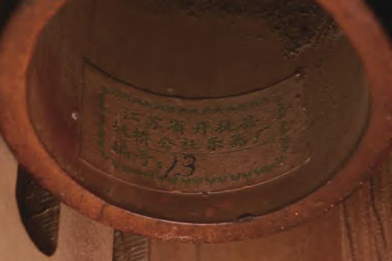 与上海的繁华景象相呼应,苏州也成为这一时期乐器制造的重要基地。45号苏州民族乐器厂制作的京胡标签用红字繁体书写,显示其可能制作于20世纪50、60年代,简化字推广、繁简体交替的时期,类似的藏品还有9号“唐泳昌”制琴、3号牡丹牌京胡。其中,来自苏州市乐器生产合作社、常州市张湧兴乐器生产小组、江苏省丹徒县姚桥公社乐器厂(见图2、图3、图4),这些合作社集中了当地的工匠资源,在保留传统工艺的同时,开始尝试标准化生产,展现出中小城市甚至公社一级的乐器生产能力。同时,国营工厂的出现也推动了乐器制作的标准化和规模化。