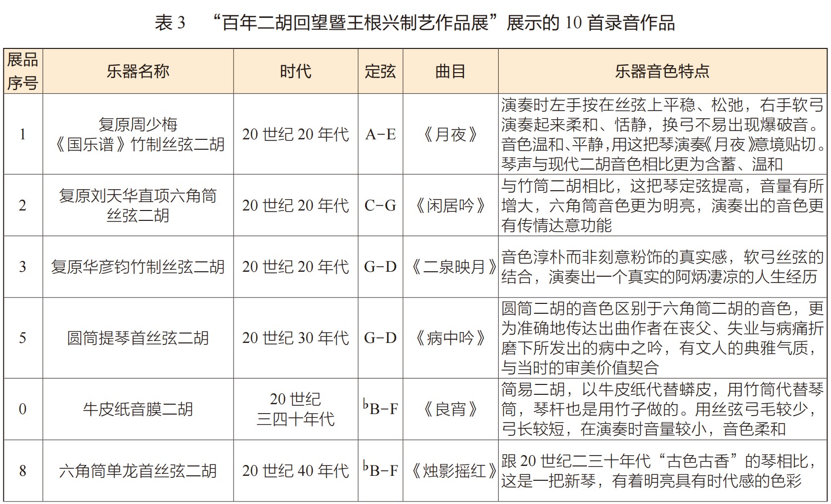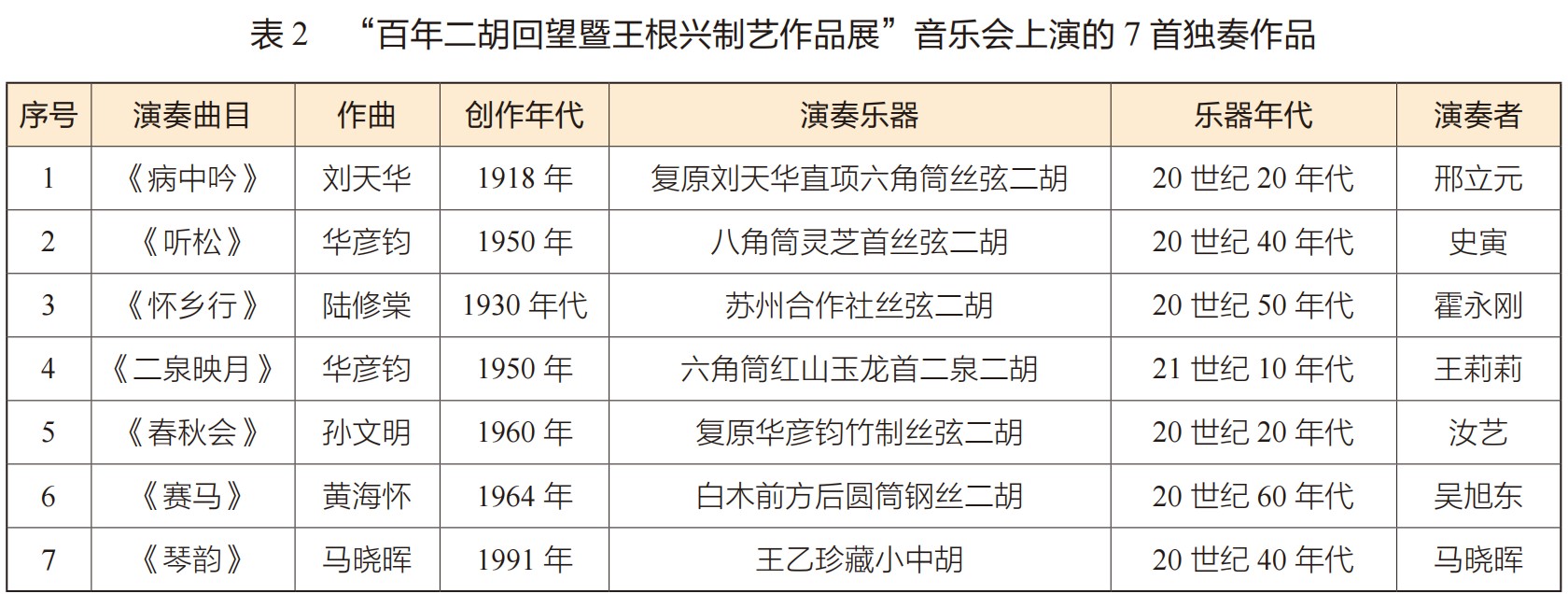 展览筹备期间,沈正国老师先后邀请上海音乐学院二胡专业教师陈春园、霍永刚、汝艺、邢立元以及在沪知名二胡演奏家马晓晖、段皑皑等分别对30余把二胡进行了试奏和鉴赏,东方乐器博物馆对试奏全程做了记录。组织者通过综合演奏家们对这批展示二胡共同的演奏体验和对声音的感受,选取了其中的10把,邀请上海音乐学院附中王莉莉教授进行了声音录制,作为展览的一部分与乐器同时展出。同时,通过演奏家们展前试奏的体验,根据各自的喜好,挑选了其中一把二胡,并选择可以发挥其乐器特点的乐曲进行演绎,于闭幕式音乐会上公开演出。④音乐会上演的7首独奏作品(见表2)、展览展示的10首录音作品(见表3)⑤和使用乐器的基本信息如下。