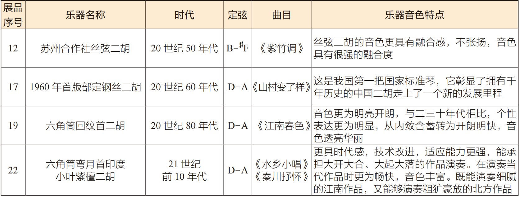 为了排除琴筒形状、尺寸、录音空间、设备等因素带来的音色差异,笔者设计了一个二胡声音采集实验⑳。考虑到丝弦—钢弦转换的年代、民间—专业用琴、不同琴弦品牌的受众面等因素,采样选用了展出中的3把二胡(见表5)。