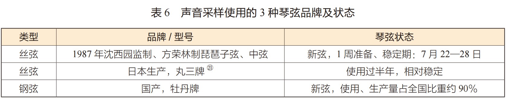 3把二胡采用了相同定弦(C-G),在录音棚现场,分别在同一把琴(琴弓、琴码、阻尼垫、千斤位置相同)上装换3种不同类型的琴弦(见表6),请同一个演奏者,尽可能保持相同的方式演奏。每一种琴弦采录内、外空弦音,高、中、低音区各一个音,内、外弦八度人工泛音各一,并且选择了能