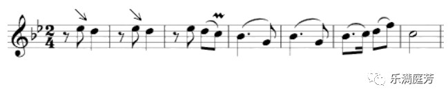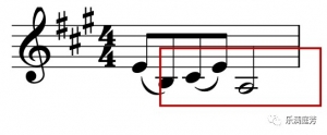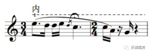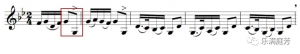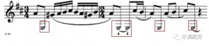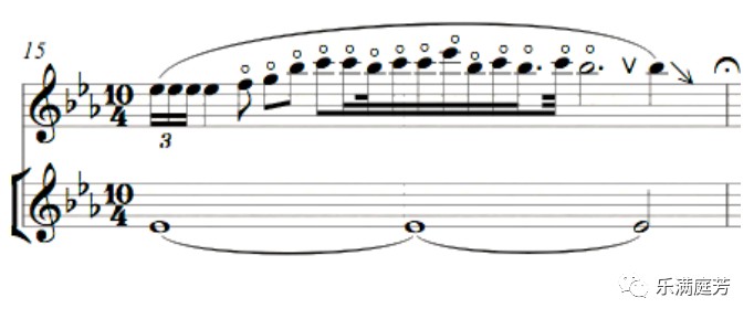 谱例1[3]三拍半的连弓表现唱之连贯(由于原调为1=#F,未避免在读谱中出现过多升号,故将其改为C调)