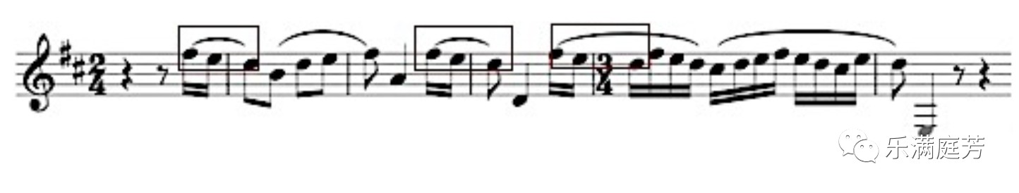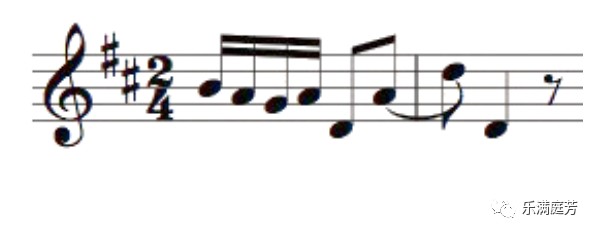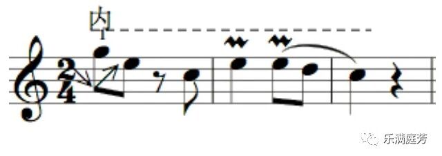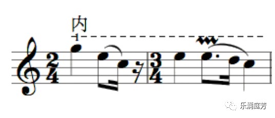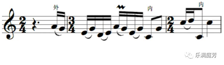 为固定音型,贯穿全曲。在弓法上是十分规整的、一拍一弓的拉奏。就在这“规整”之中,广东音乐常用旋法又悄悄显现,如多为眼起,弱拍多加花,重拍基本不加花,等等。