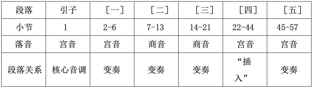 《流波曲》整体结构主要为变奏形式,以“引子”为全曲旋律的“核心音调”,通过“微变”发展为乐句、乐段进行变奏。然而,与一般的变奏结构不同的是,孙文明在第四段穿插一段“它旋律”。正是这段“插入段”赋予了《流波曲》更多的含义。