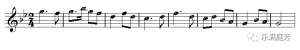 在第二段与第一段均用外弦演奏,广东音乐旋律音调隐约可见:乐句多从“眼”起(小节弱拍处),在一个乐句中,以短小素材为“动机”,运用“合头”手法发展两至三个乐逗,七声音阶以五声为骨干音,但中立音fa、xi多位于重要位置。例如: