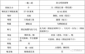 将两种二胡进行大致对比,通过表格可以一目了然地看出“孙文明胡琴”与“一般二胡”的异同。如表格10: