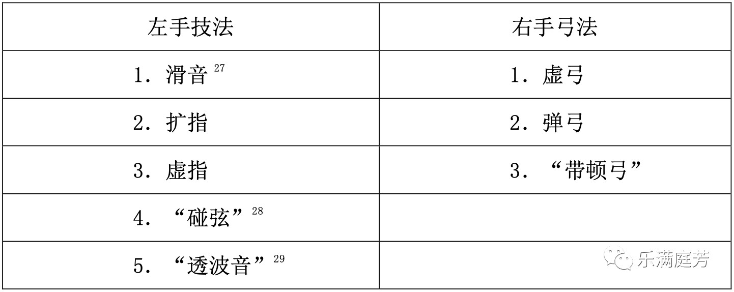 在运弓走指方面,孙文明也“创制”了许多特殊的“孙氏”技法,比如善用虚弓、弹弓;用指腹按琴弦;以及广东高胡双膝夹琴演奏方式,等等。主要包括五种左手技法和三种右手弓法,如表格12: