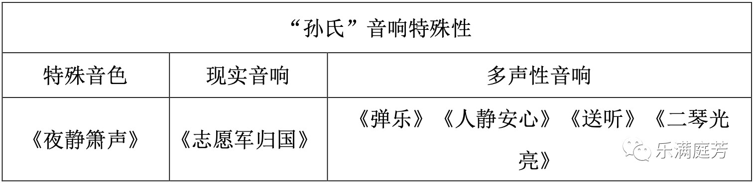 笔者首先关注的是孙文明作品中具有特殊音响的乐曲,包括《夜静箫声》《志愿军归国》《弹乐》《人静安心》《送听》《二琴光亮》。这6首曲目占孙文明全部作品的一半以上,乐曲中胡琴特殊音响在孙文明的音乐中扮演了重要角色。从而,本文试将其音色、音响特质划分为“特殊音色”“现实音响”以及“多声性音响”三个方面。如表格13: