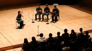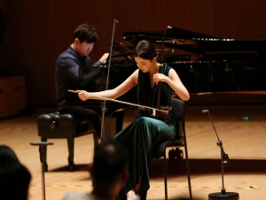 音乐会曲目遴选了五部与闵惠芬艺术生涯紧密相连的作品,在主持人萧梅教授娓娓道来的导赏中,这五部作品仿佛五枚钥匙,依次打开了通往大师精神世界的大门。开场一曲《江河水》,哀婉深沉,瞬间将观众带入闵惠芬最具代表性的艺术境界。这首由黄海怀移植的经典,在闵惠芬的弓下曾被诠释为“鞭挞黑暗的音乐檄文”。陆轶文与扬琴演奏家曹蕴的合作,气息合一,神韵贯通。作品中“压揉”技法和北方风格的“回滑音”是闵惠芬从管子演奏家谷新善那里琢磨而来,让悲愤的控诉中始终透着坚韧。曹蕴老师作为长期伴随闵惠芬演出的老搭档,以扬琴音色精巧点缀,紧密配合着陆轶文的演奏。舞台上,曹蕴望向陆轶文那认真的眼神仿佛穿越了时空,令人恍然动容。