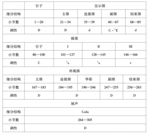 李博禅在《楚颂》中设计了两个性格呈现对比的“英雄”主题(21—34小节)与“爱情”主题(40—67小节),它们不但呈现关系大调上的属调关系,而且主题内部的调式也有着人物形象的考量:霸王的“英雄”主题采用更气势恢宏、庄严典雅的“雅乐”调式,虞姬的“爱情”主题则采用柔美隽秀、清新雅致的“清乐”调式,同时两个主题也契合了奏鸣曲式的两个主题要素。以下是对《楚颂》作品结构的图示: