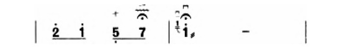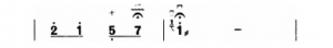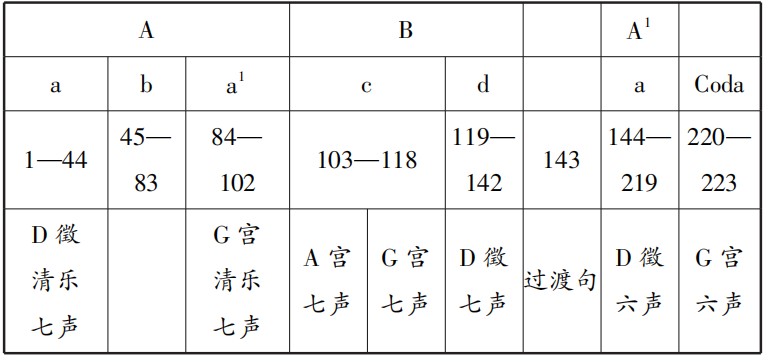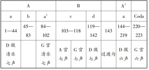 第一乐段1—102小节,是由a+b+a1组成的一个带有变化再现的三部曲式结构,调式调性上则是D徵七声清乐,通过变宫和清角的加入,表现出河南音乐独具特色的起承转合。开头两小节运用了上滑音的演奏技巧,是模仿坠胡所得来的,以此奠定了整个乐曲的风格基调及乐曲情绪。这两小节中采用了D、G两个音,而接下来的旋律都以这两个音为主体,围绕它们继续开展四度和五度的跳音。