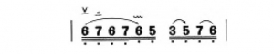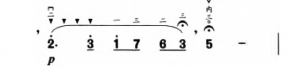 第三乐段144—219小节,首先在节奏方面,将速度进行提升,从第一乐段的每分钟132拍到现在的每分钟156拍,烘托气氛,使情绪更加热烈,与前面的慢板形成对比,从慢板的忆苦思甜到现在的展望未来,体现出河南人民土生土长的热情。节奏型上,先是采用前八后十六分音符,到后面的连续十六分音符,连续十六分音符的运用是采用了垛板的板式体裁,速度快上加快,才能够体现垛板的板式特性。此时音乐走向开始紧凑,情绪高涨,扣人心弦。在旋律特性上,只是第一乐段的a乐句进行再现,后面是一个拓展补充,在217—219小节是一个带有丰富变化音的逐级下行,顺延到尾声部分,而此时的节奏型遥相呼应,先从连续的十六分音符转换到了前八后十六分音符上,旋律走向开始变慢,直到尾声部分采用突慢的旋律处理方式,表现出河南人民对未来美好生活的无限遐想。