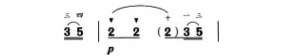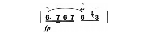 谱例中,虽然只在re、mi两个音上做了飞跃断弓的技法处理,但是在演奏者二度创作中为延续表达情感和无痕衔接旋律,可以将飞跃断弓的技法延续到泛音开始前,直接衔接泛音部分。