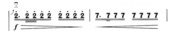 飞跃断弓实际上是移植小提琴的技巧,它是两种手法的结合,演奏时同时使用上臂和手腕。飞跃断弓与普通断弓的不同点在于弓在演奏每一个音之后都是有弹性地抬起来,形成“音断意不断”的效果。见谱例5。