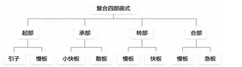 《红梅随想曲》是一首复合四部曲式结构的乐曲,该乐曲由起部、承部、转部与合部四个部分构成。曲式结构如下图所示。