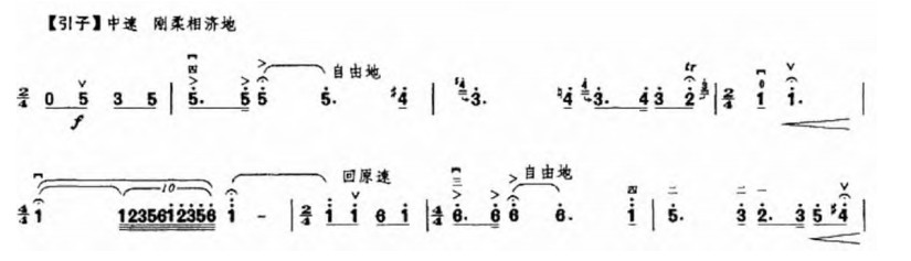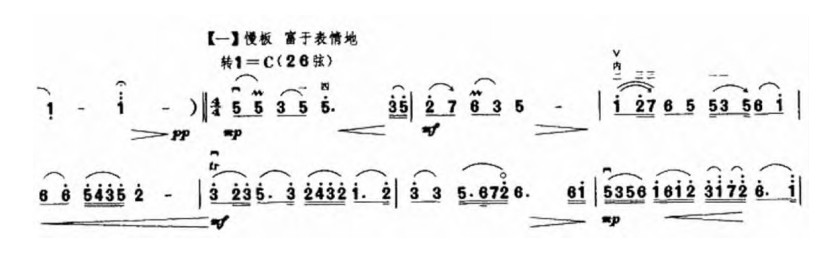 起部的第一段慢板情感没有引子那么激烈,整段赋予歌唱性、抒情性,情感在四个部分的层层递进中逐步加深,揉弦大多使用滚揉以呈现旋律柔美流畅的特点,表现主人公江姐柔和乐观的形象,开始音5中弱力度呈现,到高音5开始揉弦,并以前轻后重的方式处理渐强长音,使用迟到揉弦给听者娓娓道来、沁人心脾之感,之后的长音基本都以此风格处理,第二小节2和6加入快速的小压揉来维持中强的力度,再以5同样的迟到揉弦结束该乐句,在第四小节的高八度6给重音,渐强的力度将旋律演奏出来,慢板的第二部分是第一部分的变奏,由中强推进到强,更富于表情地演绎该部分,第三部分速度的稍快将乐曲推向第四部分的高潮,体现革命者信仰的坚定和宽广的胸怀(部分片段如下图所示)。