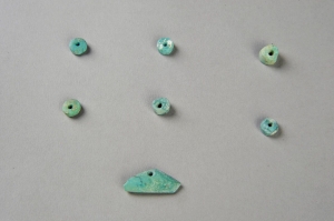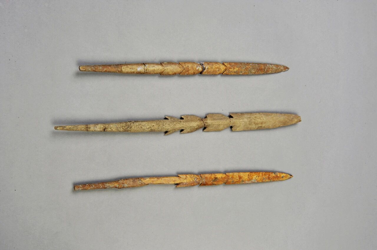 贾湖遗址出土的骨镖(上图)、石饰(下图)。图/贾湖遗址办