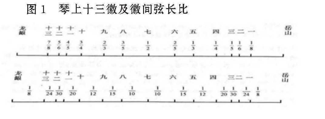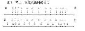 将古琴每两徽之间划分十份,可以得到117个徽分音位,其中可以产生多种音程和微音程,但多数并不具备运用在音乐中的可行性。据“安徽法”将琴上十三徽各弦长比列于下方,若设全弦长相对波长为1,那么弦长比与相对波长是一样的,可以参考李玫《东西方乐律学研究及发展历程》⑮一书中的图示(见图1)。