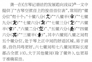 古琴上设有十三个徽位,用来标识弦上音位,除古这十三明徽外,还有很多按音指位,最早的存谱《碣石调·幽兰》就用“暗徽”①这个词来表述徽间音位。《琴书大全》辑录有晚唐琴家陈拙《琴籍·明暗徽法》②,提到每两徽间有五个音位可以选用,即“上豆许、上半寸许、下半寸许、上一寸许、下一寸许”,或“徽近上、徽中间、徽近下、徽中间上少许、徽中间下少许”,从“少许”字样可以看出这些音位缺少具体量化。此外,《琴书大全》还用某徽加距离某徽的实际长度来表达徽间音位,如“八徽上约三分五厘”,写成徽分,即七徽九分③。