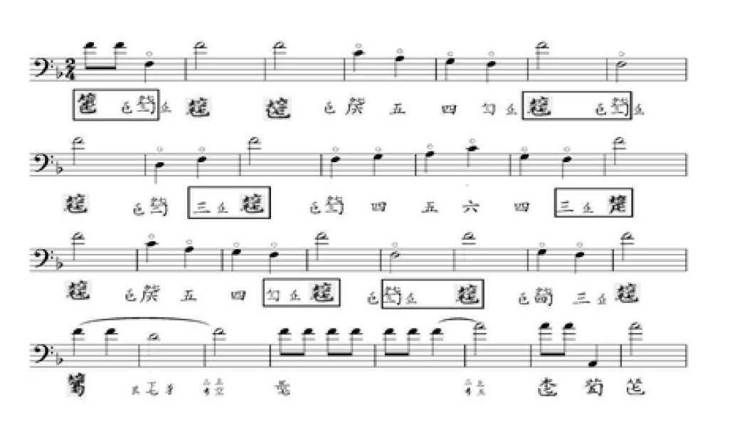 谱例中标有六个小黑框,每两个谱字一组,刚好构成隔八度的“同音相谐”,这里的“六二”使用很准确,完全符合旋律进行,徽分记谱准确。