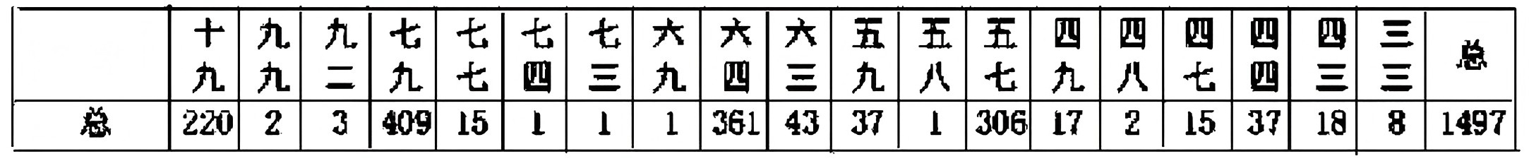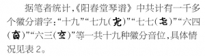 从《琴书大全》(1590)到《徽言秘旨订》(1652)这22部琴谱中,有16部出现了徽分谱字,经分析剔除不是真正的徽分,还剩9部:《琴书大全》《绿绮新声》《真传正宗琴谱》《阳春堂琴谱》《琴适》《新传理性元雅》《乐仙琴谱》《太音希声》《古音正宗》。因《琴书大全》首次明确使用徽分记写,而《阳春堂琴谱》谱字数量最为庞大,达一千多个,此处专门分析这两部。