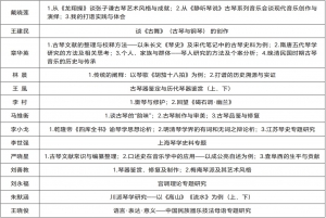 会议共分四场进行,主要围绕琴曲与琴谱、琴律、琴史与琴论、地方琴人琴派、新作品等主题展开发言。琴曲与琴谱方面有:董雯雯《喻绍泽传谱〈流水〉的谱本研究》、刘艺《论〈太音传习〉中琴曲〈白雪〉的音乐形象及文化内涵》、孙知《汪善吾与〈乐仙琴谱〉研究》、亓淼《琴曲〈神化引〉探析——以〈五知斋琴谱〉为例》、张赫《〈浙音释字琴谱〉琴曲〈黄云秋塞〉研究》、朱诗旖《〈大、小胡笳〉之“胡笳声”遗音蠡析》、姬凌宇《汪芝〈西麓堂琴统〉研究综述》、邱桐《明代早、中期琴谱“调意”指法例释》等;琴律方面如:林浩容《诸城派旋宫转调八字口诀与三弦为宫律吕命调研究》、茹奕《〈琴学初津〉琴曲音调论阐释》、谢鹏飞《〈琴谱谐声〉琴律研究》;琴史与琴论方面有:马君毅《宋元戏曲对明代琴曲歌辞的影响及其文化史意义》、梅强《字迹殊别:再论〈碣石调•幽兰〉与〈琴用指法〉抄本的差异性》、潘斌《清代拟嵇康琴赋研究》、杨天星《历代绘画中琴人的游艺与游心之道》、邢志颖《日本古琴谱字符号及记谱法的传承与衍变》、李阳《民国时期北京大学古琴相关活动发展考述》;地方琴人琴派方面有:邓晴南《浙派琴学研究评述》、曲文静《非遗背景下诸城琴派文化传承与研究现状之反思》、王艺璇《刘少椿琴学实践中的文化场域变迁研究》;新作品研究方面有:艾鹏飞《中央音乐学院古琴新作品创作情况评述——兼论古琴新作品的相关教学》、张婉晴《引禅入琴:成公亮的古琴创作观及其美学阐释》、王哲《当代古琴创作中作曲家与演奏家的合作》、唐欢《创作琴曲〈黄龙山日出〉研究》、高菲《春秋代序,秋兰为佩——古琴新作品〈秋兰兮辞〉评析》等。