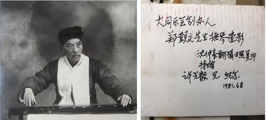 由图片可知,该图的左侧为郑觐文本人抚琴的照片,图的右侧则详细记载了其出处:“大同乐会创办人,郑觐文先生抚琴遗影,沈仲亲翻摄旧照复印,持赠,许光毅兄纪念,1981年6月”。结合后人对郑觐文弹奏古琴的评价为:“古朴典雅、苍劲有力”,可知,该评价并非空穴来风。
