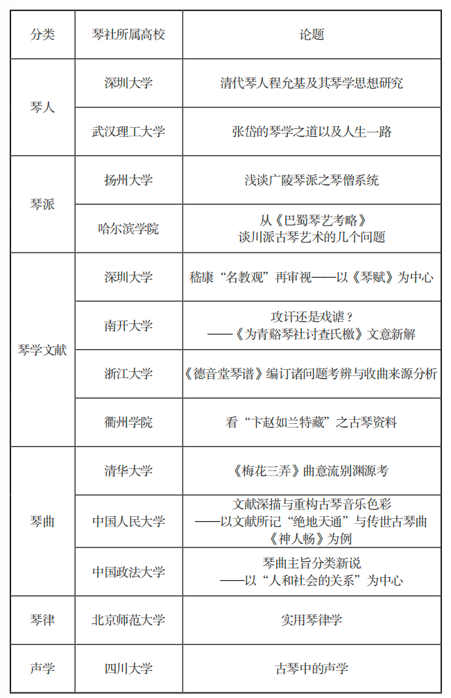 综上可知,高校琴社为琴社成员提供了学习琴学理论的途径,提高了社员对琴学这一学科的认知,使他们从被动接受琴学理论熏陶转为主动进行琴学理论研究,研究成果的涌现又推动越来越多的高校琴社开始实践技术与理论相结合的教学方式。当然,琴社成员与专业音乐学学生在琴学研究对象和方法上的差别不言而喻,但正是这种差异化的研究路径补充了琴学研究的视角。随着古琴演奏技巧和专业研究水平的不断提高,高校琴社与专业音乐学学生之间打破学科壁垒应是必然趋势。