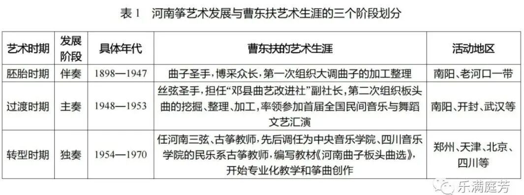 通过梳理大量文献资料发现,河南筝的发展始终与曹东扶的艺术经历息息相关,甚至具有较为直接的同步关系,故笔者以河南筝的“器乐化”程度与发展阶段为视角,将其与曹东扶的艺术生涯相应,进行了如下三个主要阶段的划分[7]: