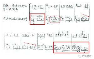 [21]笔者对马庆萌、宋光生弹奏的《鼓子前奏》、《高山流水》中筝乐声部以及十余首常用曲牌,如【马头】、【鼓子头】、【阴阳】、【坡下】、【银纽丝】、【诗篇】、【太平年】、【罗江怨】、【打枣杆】等唱腔、筝乐伴奏进行记谱分析、指法标记。