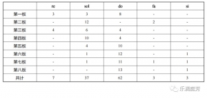 然而,固定搭尾的手法并非仅仅在乐句停顿处使用,它还深入地渗透到每一处细小的乐节之中。以河南筝曲《高山流水》为例,以下为乐曲每一乐节呼吸处固定搭尾的统计: