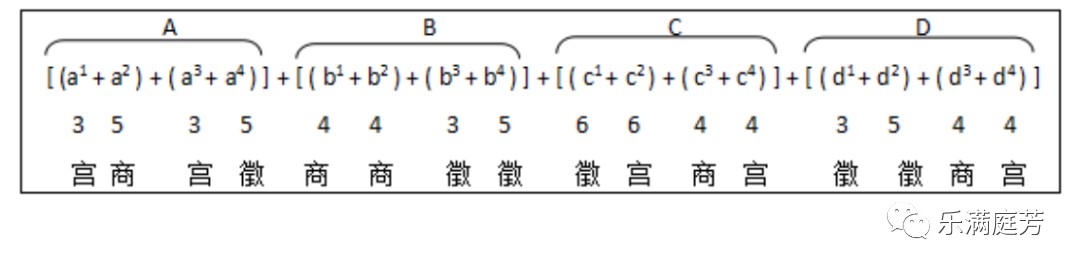 如果说【八板】为河南筝曲打造出了一副凝练坚实的结构力筋骨,那么脱离于大调曲子旋法特征的,以宫音主导、围绕“宫、徵、商”三个核心音进行的典型旋法特征则为河南筝曲的旋法规则谱写了框架,即在大调曲子核心音旋法特征的基础之上,衍生为河南筝曲中的固定搭尾并派生出慢板筝曲核心音旋律体系。