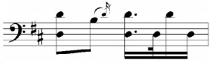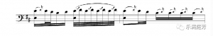 2)借鉴三弦的“粗质”颗粒感三弦的“粗质”颗粒体现在其无音孔的双面蒙皮共鸣腔所发出的音质上,弹奏时双革面的充分振动能获得浑厚有力的音响,尤其是共鸣极好的低音区极具个性的革制特殊音色,明显区别于其他两件纯木制共鸣腔体的乐器,因此,为了更好地发挥这一音色特征,三弦往往在旋律核心音上,作八分音符或四分音符的八度下行跳进,如