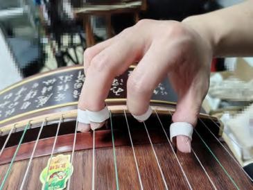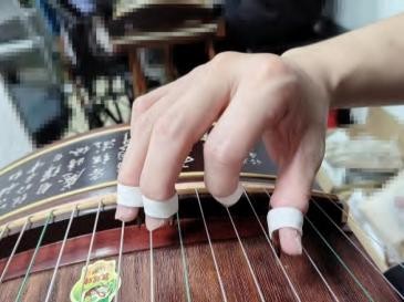 重要提示:触弦角度方面,不需要追求完全正面触弦,只要过弦时义甲的过弦角度接近垂直于琴弦,不会发出因义甲在琴弦上打滑而导致的义甲擦弦声即可。拇指打开后,拇指义甲会接近正面触弦,食指、中指和名指却是始终处于正面偏桡侧面触弦的状态,名指在放松状态下相对接近正面触弦,食指的桡偏触弦角度最大,中指的桡偏触弦角度则介于名指与食指之间。