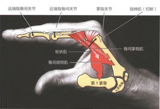 训练时则不同,因为食指、中指、名指独立性机能训练的目标是“解锁根关节”,即让控制根关节屈曲的蚓状肌能参与到发力中,如图2所示。