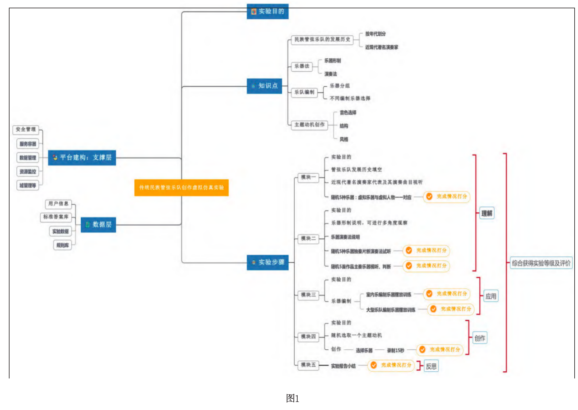 虚拟仿真实验项目的方案设计体现了教学实施的全过程。方案设计不仅包括实验内容要具有明晰的设计思路(包括实验目的、实验过程、每个模块的练习题库设计、实验报告撰写等),还应包括多种教学方法的融合使用、对教学难点的突出、对实验目标的达成度的层次划分等。以“传统民族管弦乐队创作虚拟仿真”实验项目为例,实验项目的方案设计如图1所示。