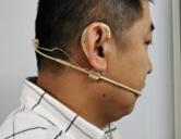 戏曲演出扩声当中针对演员在演出过程中所用的话筒从最初的强指向性枪式话筒(见图 10)和界面话筒(见图 11)转变到以领夹式话筒为主要的声音拾取设备,最近几年逐步开始过渡到头戴式话筒。在 90 年代,戏曲舞台对演员演唱进行扩声用的话筒还是以强指向性枪式话筒和界面话筒为主,这两种话筒作为一个时代的代表,可以说在戏曲舞台上占据了多年的主导地位,受当时技术水平的制约,戏曲演出对于演员声音的拾取并没有特别有效的办法,这两种话筒在使用上有一定的局限性,一方面是灵敏度较高,在建声环境普通的场地演出,如果操作不当极易产生声反馈现象,另一方面是拾取声音角度较小,不容易将舞台上各个位置的声音均衡拾取,造成因为演员走位而导致与话筒距离忽远忽近,而且在拾取声音的过程中,很多空间噪声被拾取,造成观众在听戏的过程中,主扩音箱发出的声音忽大忽小,且声音不实,有很强的距离感。随着科技的进步,90 年代末的戏曲演出,演员普遍都使用上了领夹式话筒(见图 12),这种话筒的优点是灵敏度较高,使用方便,可以将话筒夹至演员演出服装领口附近的位置,进一步拉近了声音拾取的距离,同时有效避 免了与主扩音箱和反送音箱因话筒灵敏度以及在舞台上所处位置不同的问题发生啸叫。但 是领夹式话筒也有一些不方便的地方,在演员佩戴过程当中,有可能因话筒佩戴位置不合 适,导致与演出服装摩擦所产生的巨大噪音,演员在换装时,因换装时间紧迫,而导致未 能佩戴在最合适的位置而影响声音的拾取,在演员有较大支体动作表现时,因拾音距离与 角度急剧变化而导致声音的不稳定,以及演员随意私自调整话筒位置导致话筒掉落影响演 出等问题。最近几年,头戴式话筒(见图 13)的使用占据了戏曲演出的主要位置,因为头戴式话筒与演员发声的位置距离更近,对于声音的拾取更近细致,同时又可以将头戴式话 筒很好的与演员脸上的部分皮肤通过专业方法进行很好的固定, 以保证无论演员面朝何方,话筒与嘴的相对位置始终保持不变,确保拾取声音音量的统一性,在演员换装时,也不必 将头戴式话筒摘下,最大限度的保证了演员的机动性与灵活性同时也保证了声音拾取的客 观统一性。