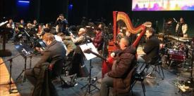另一种情况是从作曲家创作开始就离不开扩声技术的支持,完全需要依赖扩声技术才能实现作品的呈现,如青年作曲家李玥锦创作的古琴协奏曲《秋蒲蓉宾图》(见图 9)这个作品的主奏乐器为古琴,协奏为 60 人左右的民族管弦乐团,根据图片显示我们可以直观的看到乐队与古琴所呈现的演奏状态,古琴自身的音量较小,在配合大型民族管弦乐团演出时,必须依靠扩声技术的支持,否则将完全听不到古琴的声音,像这种情况就属于创作者从创作开始就需要扩声手段的介入,如果没有扩声支持,则完全不能展现作曲家的创作意图,类似这样的作品演出,扩声主要可以帮助古琴解决与乐队的音响平衡问题, 同时也帮助解决自身的音色与音质的问题。随着不断涌现出的新作品,对于扩声的需求变的紧密且多样性。