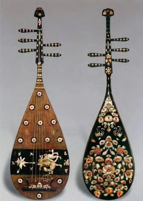 其原因自然是来自中国。直项琵琶的颈项是挺直的,曲项琵琶是屈曲的,有90°的折角。这种五弦琵琶称为“龟兹琵琶”,来自西域地区,故亦称胡琵琶或胡琴,又称“凤首琵琶”,是从琴首上的装饰而得名。