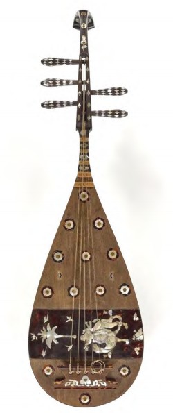 日本筑前四弦琵琶的曲项似乎大于90°,用黄扬木制作,用紫檀木制作弦轴。
