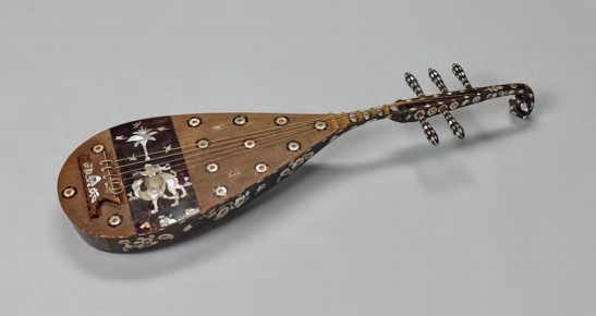 这种曲项琵琶的原产地在波斯,经中亚、龟兹后传入中原。准确的传入时期,已不可考。最早见于文字记载的则在北魏。《通典》云:“自宣武(按:指北魏宣武帝拓跋恪,在位时期为500~515年)以后,始爱胡声,泊于迁都,屈茨(龟兹)琵琶、五弦、箜篌、胡笠、胡鼓、铜钹、打沙锣、胡舞、铿锵镗铬,洪心骇耳。”[16]