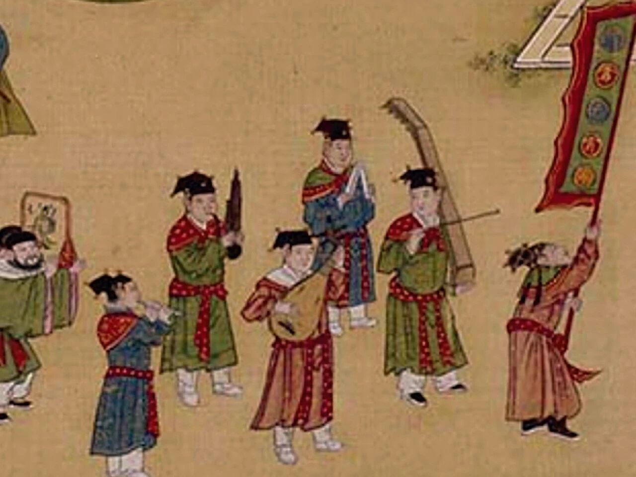 如果上述环抱琵琶的姿态尚可完成简单的音高或击打拍子的演奏,还有一类图像更特殊。明人绘《宪宗行乐图卷》(见图2) 7 中的琵琶演奏者,向上斜持一四弦曲项琵琶,左手扶琵琶相位,右手位于琵琶上方。河南禹县白沙宋墓壁画散乐图,琵琶演奏者身体、双手与琵琶的角度与《宪宗行乐图卷》几乎一模一样。以这样的姿态在行进中演奏,琵琶重心一定需要依靠外力支撑,否则,无法完成演奏。