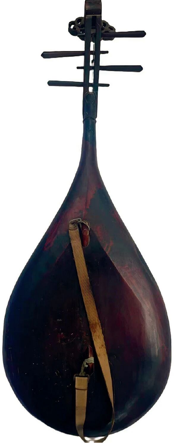 2024年,上海音乐学院东方乐器博物馆的“丝路随响”乐器展中,展出一面陕北琵琶。其结构不同于现代琵琶,背部上下分别有两个木质“背扣” 12 ,一根红色的绸带两端分别系在上面,类似吉他肩带。乐手演奏时将绸带挂于右肩或斜挎于背后,以解放双手。这根绸带是否会是那个“中介物”?为此,笔者于2024年9月专门赴陕北考察,在绥德、延长、子洲等地的说书人乔仰文、刘忠元等收藏上百年的琵琶(见图3)上,也看到了这个背扣和丝带。这种以肩带将琵琶固定在身上演奏是陕北说书琵琶普遍采用的方式,用相同方式抱持琵琶的还有云南丽江的纳西琵琶(见图4)。
